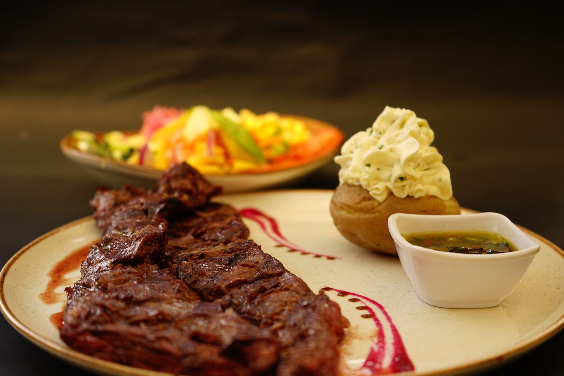 350 Gr de sobrebarriga, acompañado de papa sour cream, chimichurri y ensalada de la casa.