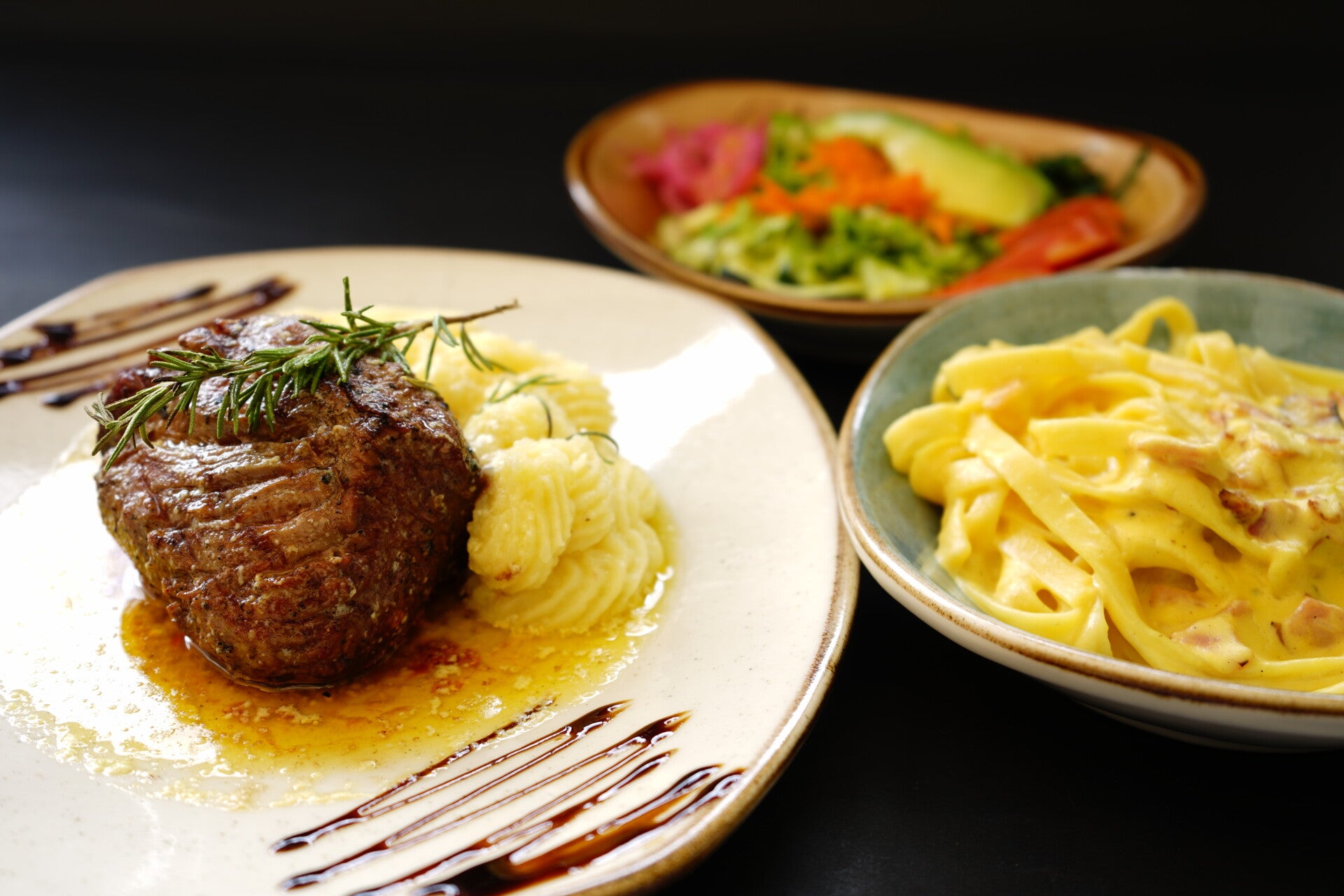 300 Gr de lomo fino bañado en una mantequilla compuesta, sobre una cama de puré de papa, acompañado de fetuccini carbonara y ensalada de la casa.