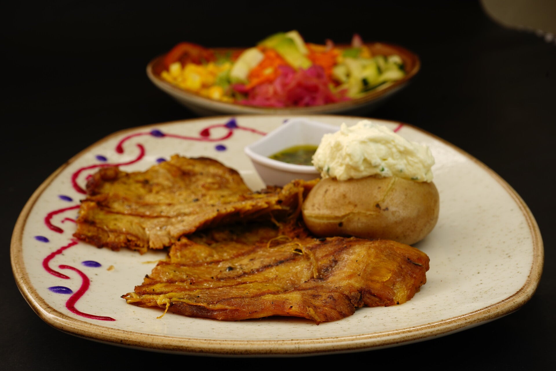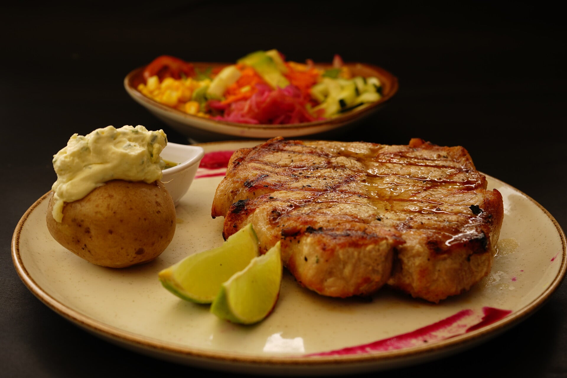 400 Gr de lomo de cerdo, acompañado de papa sour cream, chimichurri y ensalada de la casa.