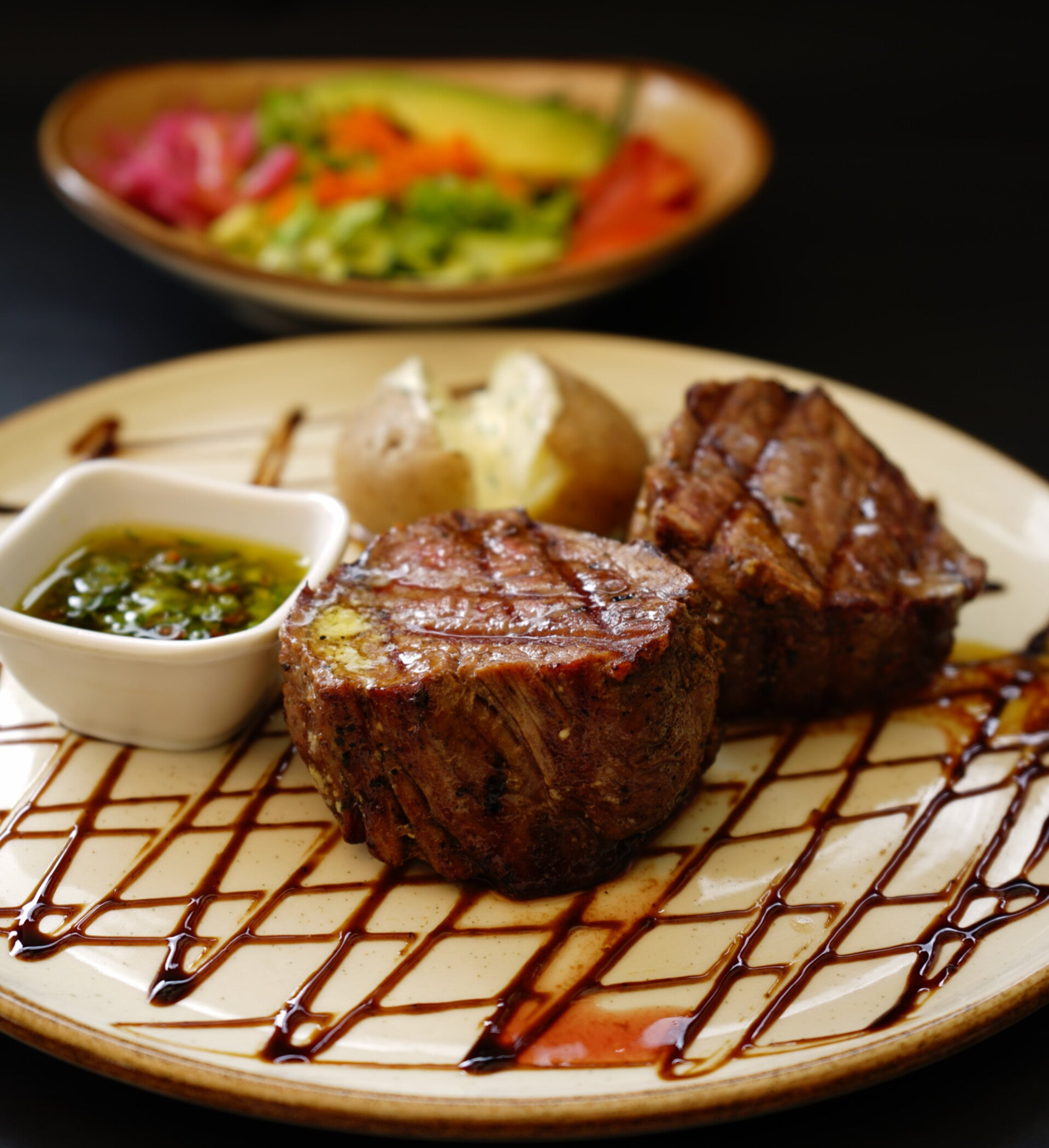 500 Gr de chata de res y lomo fino, acompañado de papa sour cream, chimichurri y ensalada de la casa.