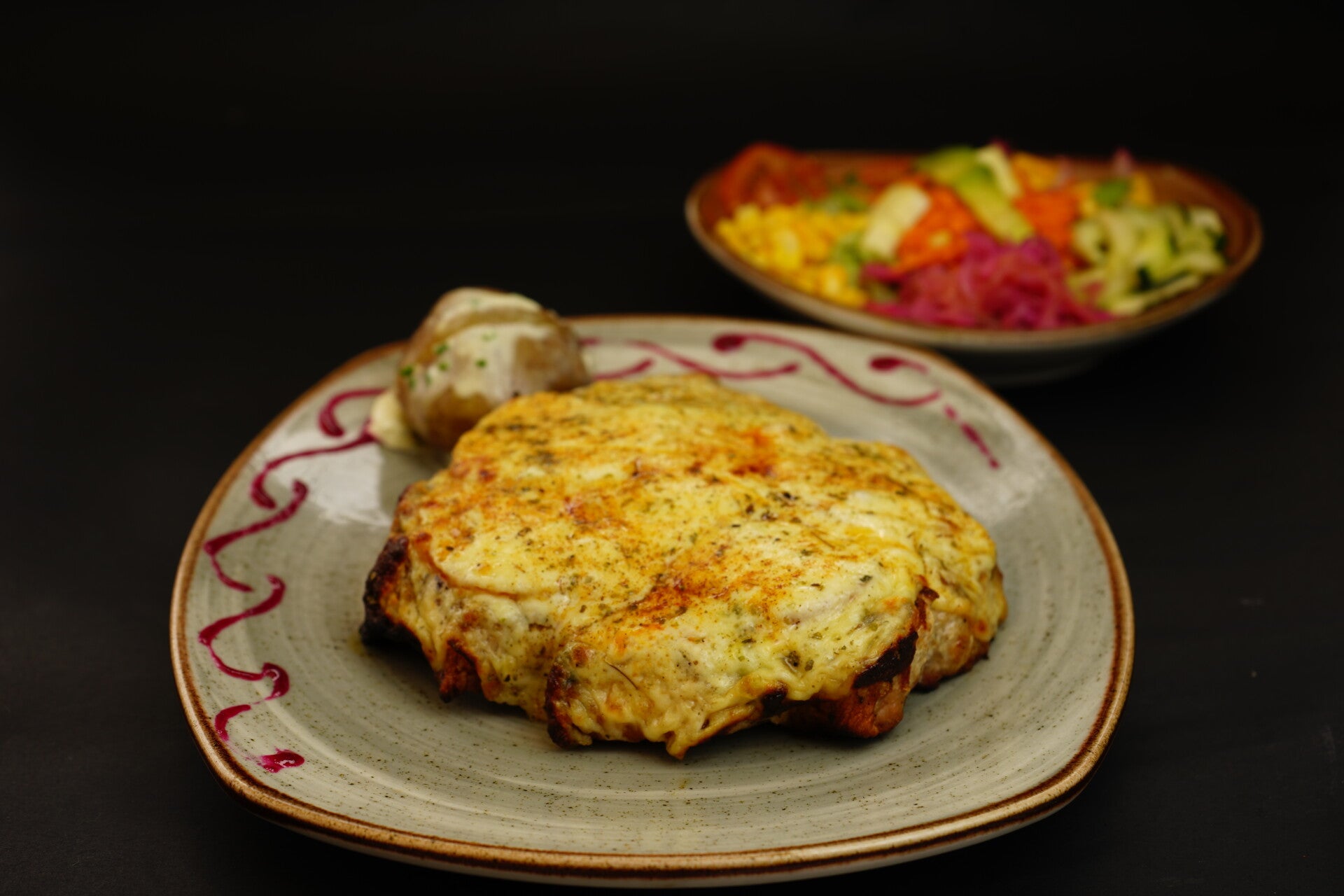 400 Gr de lomo de cerdo gratinado con tomate, queso y oregano, acompañado de papa sour cream y ensalada de la casa.