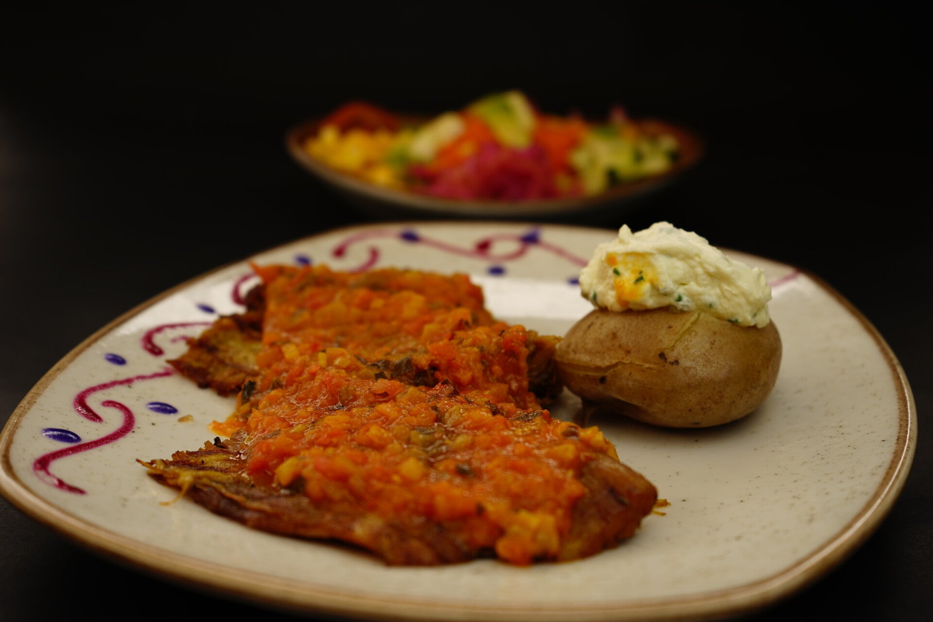 350 Gr de sobrebarriga bañada en hogao, acompañado de papa sour cream y ensalada de la casa.