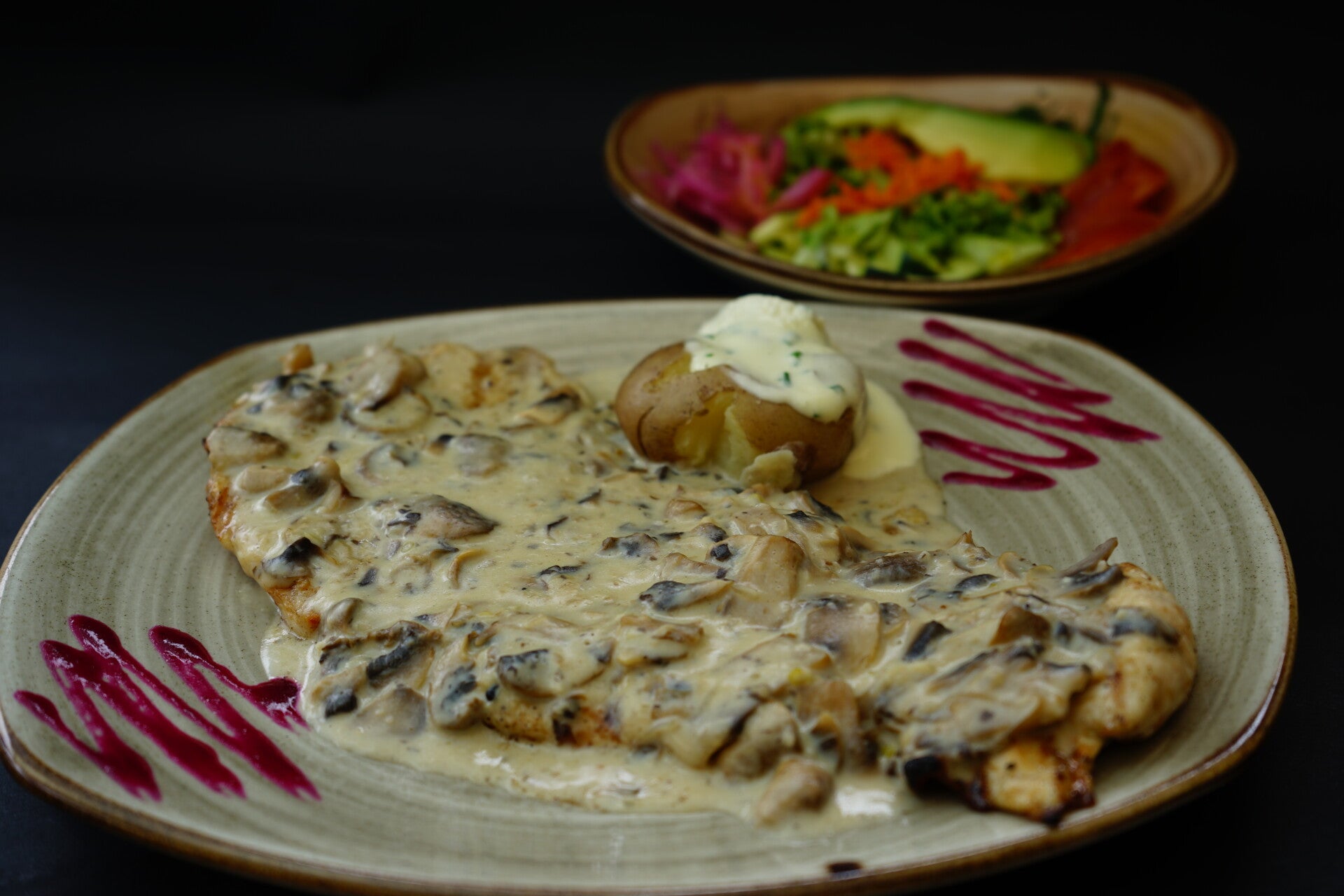 400 Gr de pechuga de pollo , acompañado de papa sour cream ensalada de la casa.