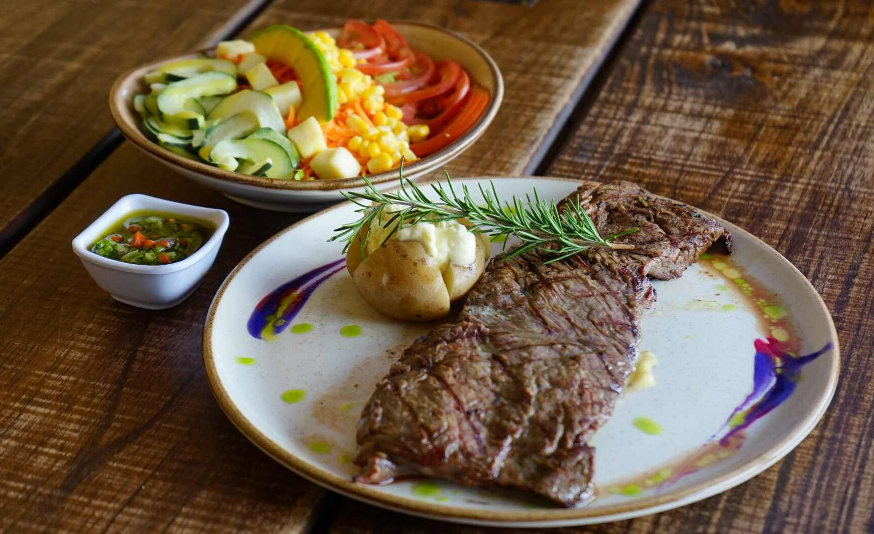 400 Gr de chata de res, acompañado de chimichurri, papa sour cream y ensalada de la casa.